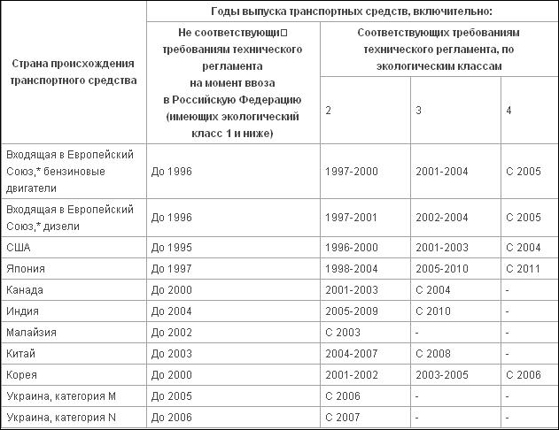 - С помощью таблицы, разработанной Росстандартом. В таблице указаны страны-производители и года, в период которых в них выпускались машины, соответствующие требованиям стандартов.