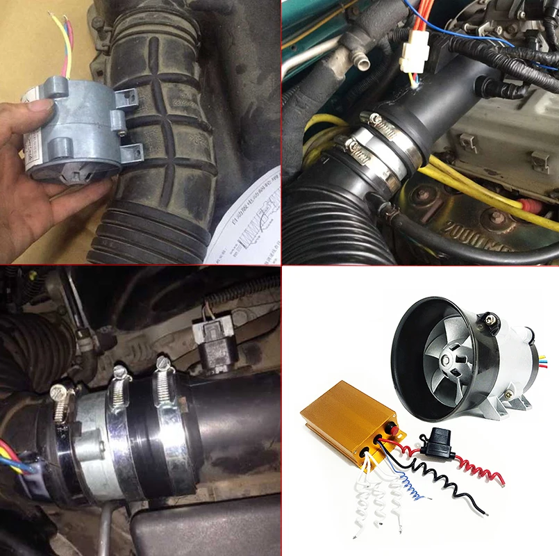 Китайские производители предлагают разные модели электрических турбин. Устройства пользуются популярностью, благодаря доступной цене, широкому ассортименту. Однако всегда можно «нарваться» и на сомнительные аналоги. Такие изделия предназначены для установки в разрыв воздухозаборного шланга с целью нагнетания воздуха в камеру сгорания ДВС.