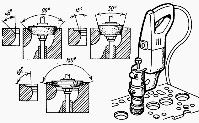 Установка седла — наиболее ответственный этап работы. Для облегчения установки седла головку блока следует подогреть до 180-200oС, а само седло охладить в жидком азоте или углекислоте. Запрессовка осуществляется ударным способом и быстро, чтобы до ее окончания не произошло выравнивание температуры деталей. Как поправить седло? Изношенное или замененное седло обрабатывается для придания ему соответствующего профиля. Очевидно, этот профиль должен соответствовать форме тарелки клапана, иначе возможны негерметичность сопряжения, перегрев и разрушение тарелки и седла клапана.