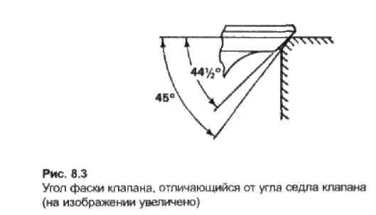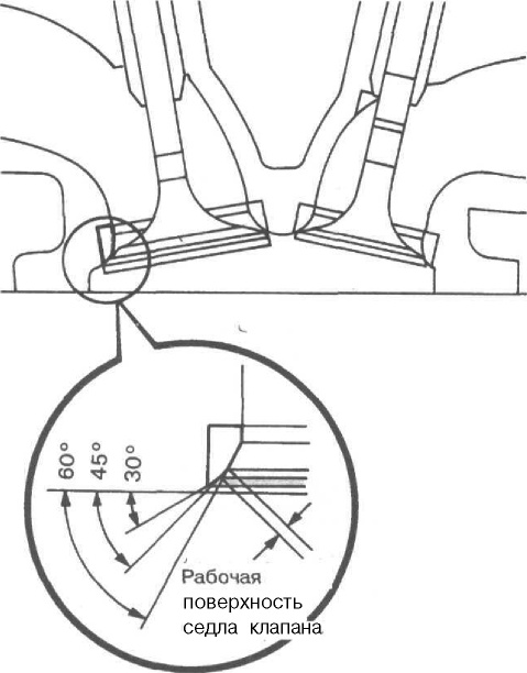 Поверхность контакта тарелки с седлом должна располагаться на расстоянии 0,4-0,8 мм от наружного диаметра тарелки. Приближение поверхности контакта к кромке тарелки улучшает перенос тепла от клапана в седло. Чтобы добиться требуемого профиля седла, рекомендуется вначале обрабатывать основной угол седла (его обычно делают на 0,5-1o меньше угла фаски клапана, чтобы ускорить приработку клапана к седлу), затем — верхний угол для обеспечения высоты рабочей фаски седла, после чего — угол, примыкающий к поверхности камеры сгорания, обеспечивающий нужный диаметр седла.