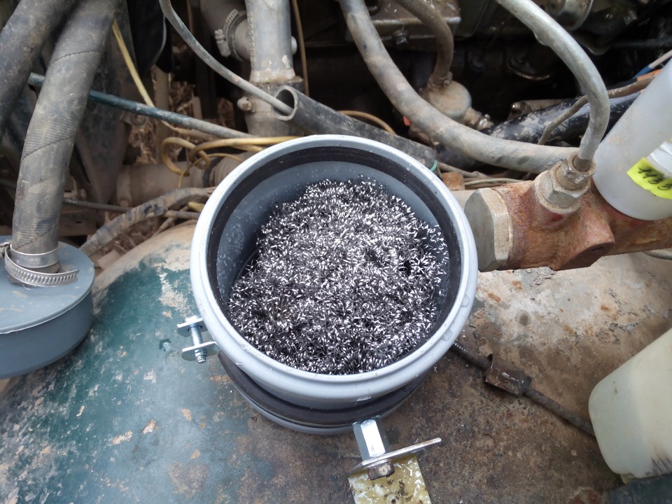 - Внутрь муфты набиваем металлические губки в качестве фильтрующего элемента. Они будут улавливать грязь, капилляры масла. Плотно забивать губки внутри муфты не стоит, так как это осложнит прохождение воздуха.