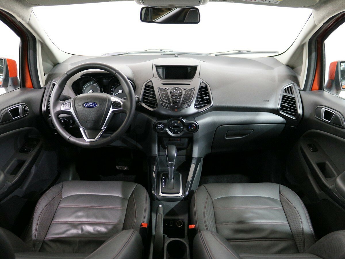 Форд Экоспорт по фото салона смотрится не менее ярко и броско, демонстрируя свои, откровенно говоря, дорогостоящие и солидные материалы отделки. К слову сказать, используется не только классический и приевшийся везде мягкий пластик, но и натуральная кожа и даже полноценные декоративные вставки из металла и дерева.