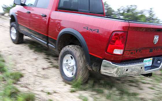 Шины Раптора нацелены на хорошие показатели. Они могут быстрее изнашиваться, и их замена, вероятно, обойдется дороже, однако они выше и, как нам представляется, великолепно приспособлены к данному пикапу. Оси Пауэр Вэгона смогли бы легко выдержать шины аналогичного размера, однако инженерная команда Доджа предпочла остановиться на шинах, которые в большей степени способствовали бы сохранению надежной буксировочной способности этого пикапа. Нам хотелось бы увидеть шины, которые лучше вели бы себя при езде по грязи, причем немного более высокие, дабы польстить дизайнерскому пакету Пауэр Вэгона, однако очень затруднительно найти что-нибудь похожее в эквивалентном диапазоне нагрузок.