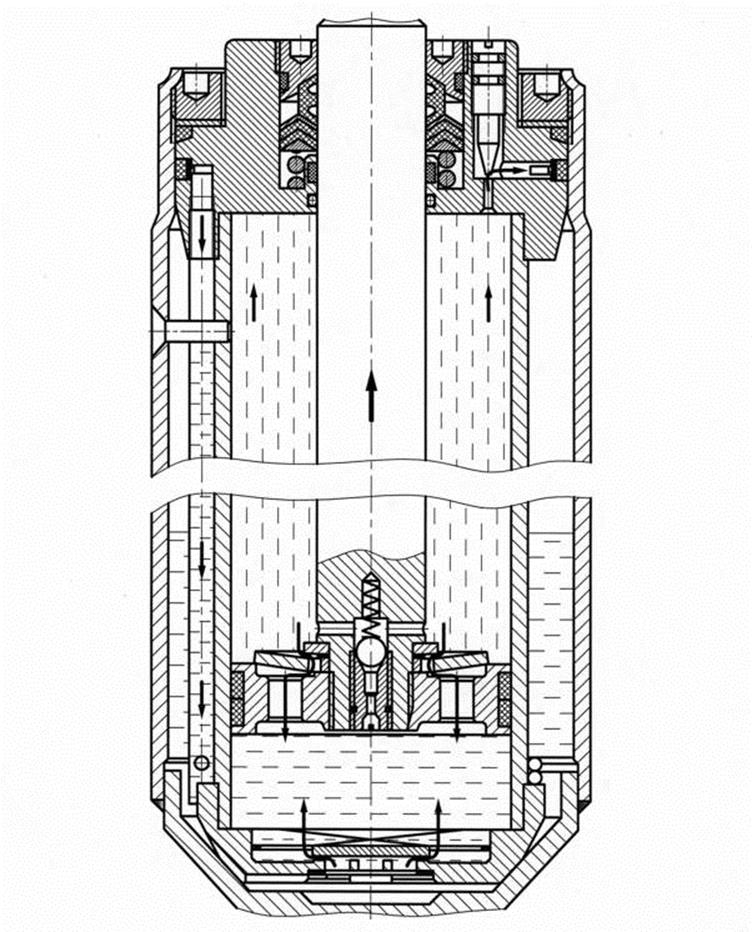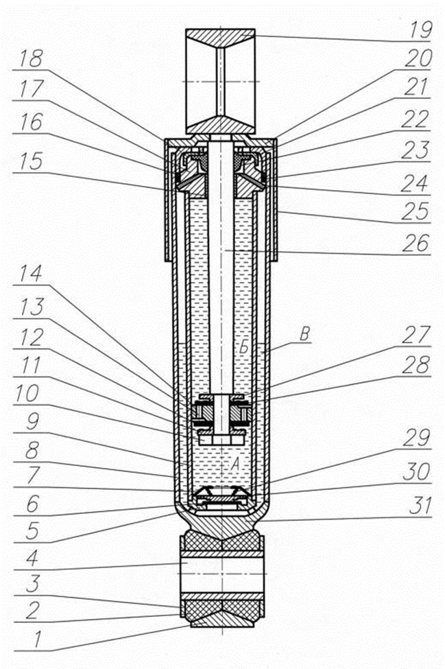 В это время давление жидкости в надпоршневой 12 и подпоршневой 10 полостях цилиндра 4 выравнивается, так как полости 10 и 12 соединены между собой через большие отверстия 11 поршня и приподнятого вверх клапана 6. При движении поршня 6 вверх (ход растяжения) верхний клапан 7 закрывается под действием повышенного давления в надпоршневой полости 12 и жидкость с сопротивлением перетекает через дроссельные каналы в подпоршневую полость 10. Одновременно в полости 10 наступает разрежение, вследствие чего нижний клапан 5 поднимается и пропускает жидкость из резервуара 5 в подпоршневую полость 10, восполняя недостающий объем жидкости, поступающий из меньшего надпоршневого пространства, включающего объем штока 1.