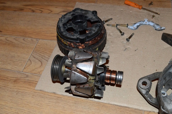 - Отсоединение задней крышки со стороны привода и контактных колец. Также снимаются статор, корпус выпрямительного блока и ротор.