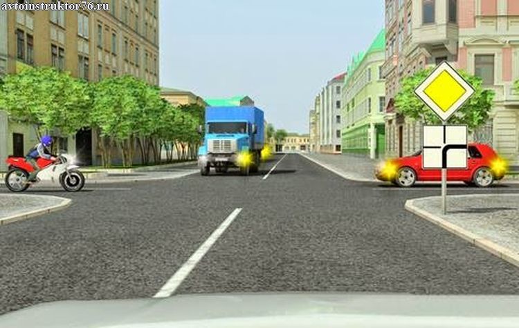 В данном случае вы находитесь на главной дороге (знаки Главная дорога и Направление главной дороги ) и имеете преимущество перед легковым автомобилем независимо от направления вашего дальнейшего движения. А вот по отношению к грузовому автомобилю, также находящемуся на главной дороге, действуют правила проезда перекрестков равнозначных дорог, в соответствии с которыми вы должны уступить ему дорогу, поскольку он приближается справа.