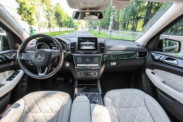Так как фронтальная часть GLS во многом унифицирована с менее крупным GLE, то и передняя панель салона у него выглядит аналогично: два огромных 12-дюймовых дисплея, расширенная атмосферная подсветка, умный комфортный пакет (дебютировал на S-классе) и другие опции. Но набор оборудования расширен решениями вроде пятизонного климата, крупных мониторов на втором ряду (интересно, когда уже предложат дисплеи для третьего ряда?), цветного проектора высокого разрешения, а также функции «автомойка», когда автомобиль складывает зеркала, задраивает окна, отключает датчик дождя и включает рециркуляцию климата для спа-процедур на автоматической мойке.