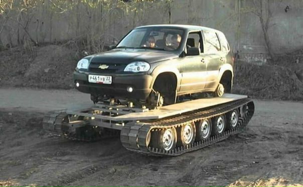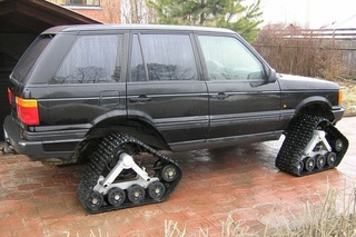 Суть решение проста до безобразия и не требует ничего снимать-переставлять – автомобиль просто заезжает по рампам в гусеничный модуль! Тот пристегивается к машине с помощью универсального крепежа – а дальше колеса крутят гусеницы через специальные барабаны, позволяя разгоняться до 65 км/час. При этом под установку модулей не надо дорабатывать кузов и колесные арки. И в компании уверяют, что один человек может превратить автомобиль в танк и обратно всего за 10-15 минут! Но все равно придется повозиться. Ведь каждый такой модуль весит по 170 кг! Вытащить его в одиночку из машины нетрудно, а вот закатить обратно…Да и не в каждый багажник поместятся четыре таких трака, так что удобнее всего эти модули возить в пикапе. Придется и ключами погреметь: на машину надо заранее ставить некоторые детали крепежа и ограничители хода гусениц, не дающие им задеть крылья и пороги кузова. Хотя даже несмотря на эти препоны, ничего проще для автомобилей пока все равно не выпускают. Но все равно будем ждать, когда все-таки придумают выдвижные гусеницы, чтобы превратить легковушку в танк можно было одним нажатием кнопки.