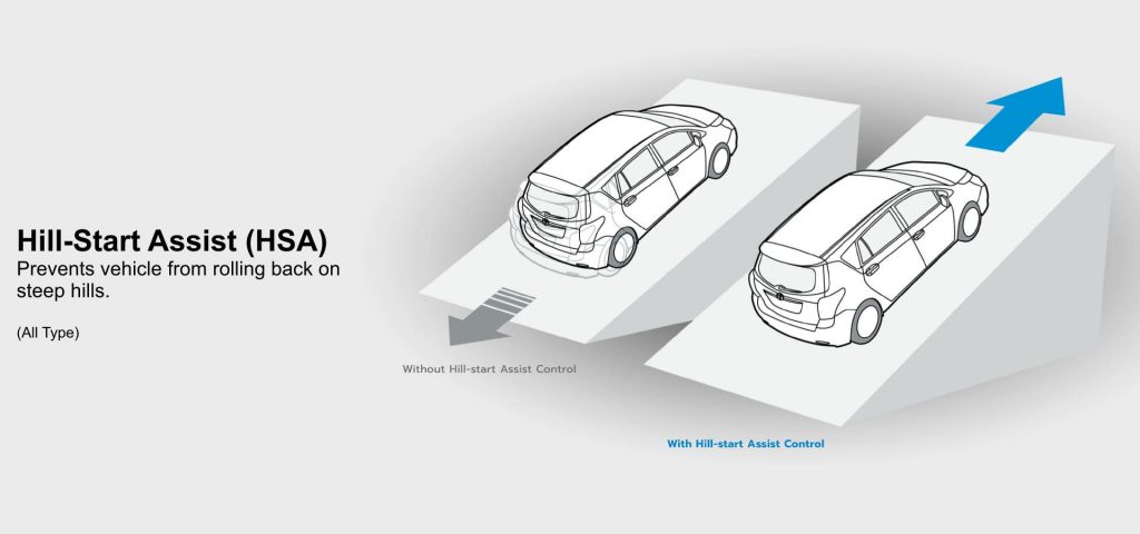 Penggunaan Hill Start Assist HSA adalah fitur yang bekerja dengan menggunakan sensor untuk mendeteksi lingkungan waktu kendaraan berada di tanjakan atau turunan.