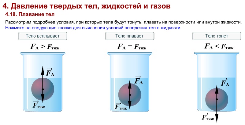 С помощью формулы (9.4) можно установить условие плавания тел. Тело будет плавать, если сила Архимеда будет больше действующей на тело силы тяжести