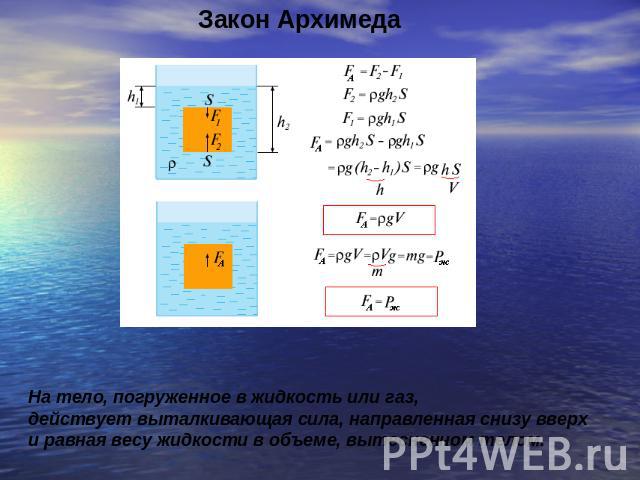 Благодаря зависимости гидростатического давления жидкости от глубины возникает своеобразный эффект выталкивания тел, погруженных в жидкость, из этой жидкости. Действительно, в жидкости, находящейся в поле силы тяжести, возникает гидростатическое давление, и жидкость оказывает воздействие на поверхность тела, опущенного в жидкость. При этом силы, действующие на боковые поверхности тела, компенсируют друг друга. Однако из-за зависимости гидростатического давления от глубины, сила, действующая на более глубокую (нижнюю) поверхность тела, больше силы, действующей на верхнюю поверхность (см. рисунок), и на тело действует результирующая сила, направленная вертикально вверх. Эта сила называется выталкивающей силой или силой Архимеда. Можно доказать, что на тело, целиком погруженное в жидкость, действует выталкивающая сила