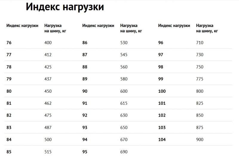 Индекс нагрузки неразрывно связан с размером резины. Состоит из двух, реже из трех цифр. Расшифровка указана в таблице значений: