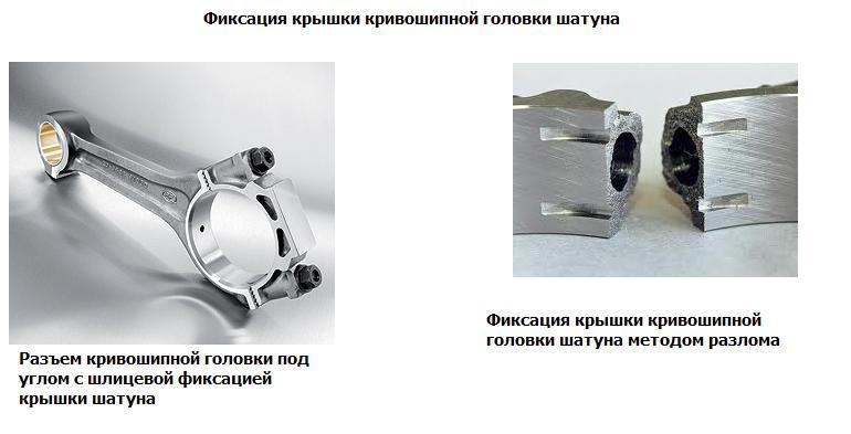 Сломанный шатун с трапециевидной проушиной и крышкойШатуны отдельной фракции ( треснувшие, ) производятся в виде одной детали, снабжены надрезами (Sinterpleuel) или лазерными надрезами (стальные шатуны), а затем разбиваются в местах надреза на две части.Поверхности излома точно совпадают, и шатун и крышка шатуна могут быть навинчены на кривошипный штифт коленчатого вала во время сборки. На собранном шатуне линии разъема почти не видно. Из-за индивидуальной геометрии излома обе части шатуна принадлежат друг другу и не могут быть заменены по отдельности. Разъемные шатуны имеют преимущества с точки зрения прочности, точности изготовления и производственных затрат. Гарантируется точная подгонка и передача мощности лучше, чем при использовании двух отдельно изготовленных компонентов.