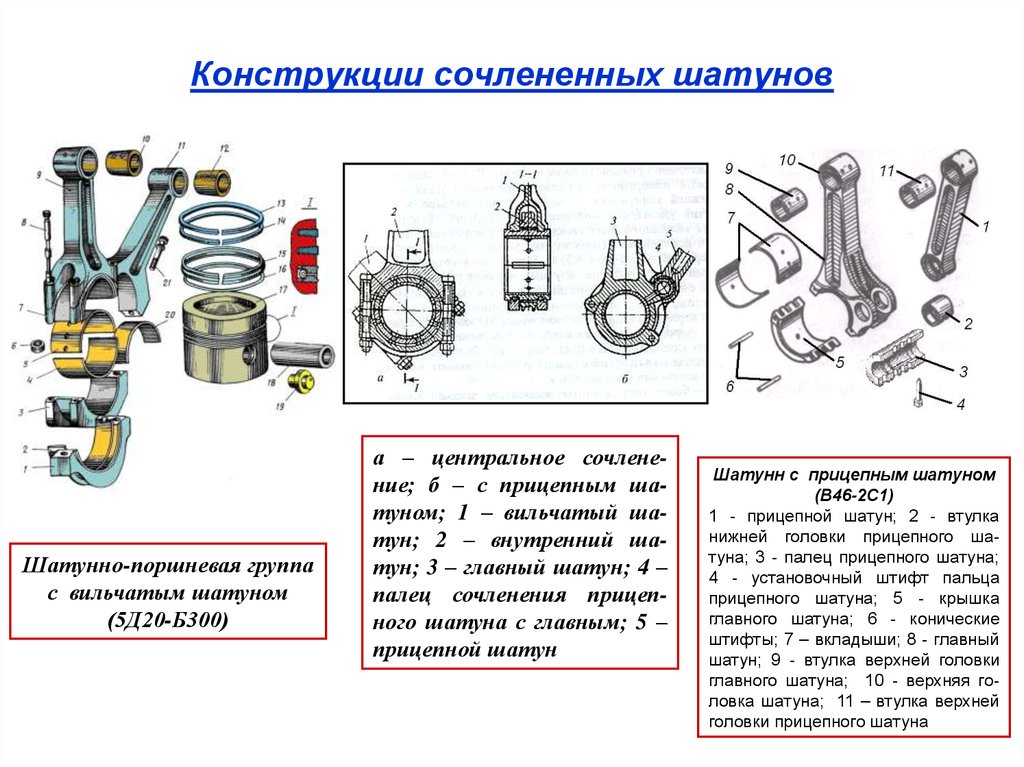 Главная и вторичная шатуны дизель 1-5Д 49 Советский тепловоз ТЭ109Существует также другой тип шатуна вилки: шатун на смещении коленчатого вала, но шатун поднимается вверх по Y-образной форме, чтобы направлять два поршня: один поршень нормальной конструкции, поршень и проушина шатуна, каждый с круглым расточка, другая проушина тоже круглая, но поршень с прорезью для свободы передвижения второго поршневого пальца.Эта конструкция использовалась Пухом с 1920-х годов для так называемого двухпоршневого двигателя, основанного на двухтактном принципе, но позже была заменена конструкцией рычажного механизма или вспомогательного шатуна. Преимущество двойного поршня заключается в асимметрии пазовых регуляторов газообмена, что стало возможным благодаря смещенному ходу двух поршней. С другой стороны, имеются значительные недостатки: проблемы с охлаждением, стоимость конструкции и двойная общая камера сгорания неблагоприятной формы с длинными путями пламени и относительно высоким потреблением.И вилка, и шатуны, использующие асимметричные фазы газораспределения, можно найти на мотоциклах Puch с начала двадцатых до конца шестидесятых. Между концом сороковых и серединой пятидесятых годов на мотоциклах завода Triumph в Нюрнберге шатуны были раздвоены параллельно оси коленчатого вала, что, однако, не позволяло добиться асимметричной синхронизации.