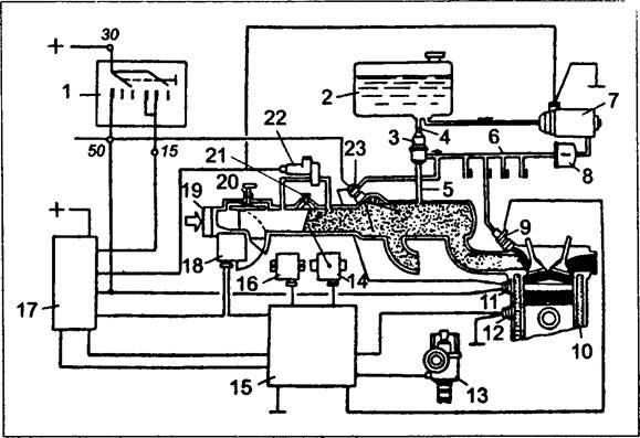 1 – топливный бак; 2 – электрический топливный насос; 3 – гидроаккумулятор топлива; 4 – топливный фильтр; 5 – стабилизатор перепада давления топлива; 6 – форсунка; 7 – впускной трубопровод; 8 – пусковая форсунка; 9 – дозатор; 10 – измеритель расхода воздуха; 11 – электрогидравлический корректор давления; 12 – лямбда-зонд; 13, 14 – датчики температуры охлаждающей жидкости; 15 – распределитель зажигания; 16 – регулятор холостого хода; 17 – датчик положения дроссельной заслонки; 18 – ECU; 19 – выключатель зажигания; 20 – аккумуляторная батарея.