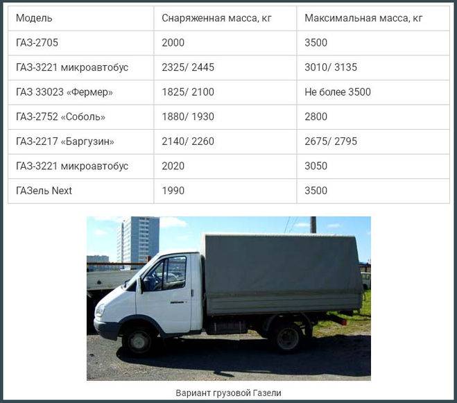 Грузовая «Газель» может перевозить до 1,5 тонны груза, при максимально разрешенной массе 3,5 тонны. Однако это касается не всех моделей, ведь есть варианты с кабиной, открытым кузовом, тентом и даже термобудкой.