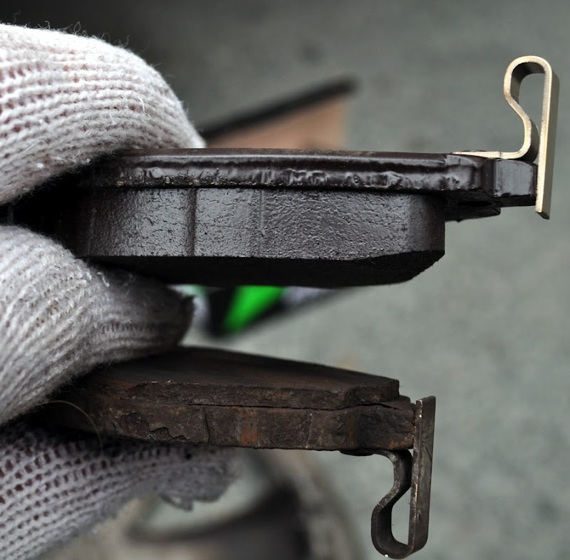 То есть, ввиду того, что фрикционный материал максимально стерт, а соприкосновение колодки с диском происходит за счет металлического основания, то и коэффициент торможения снижается, увеличивая длину тормозного пути.
