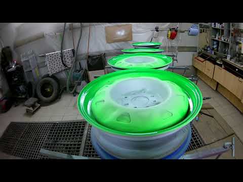 Краска, как и грунтовка, наносится в два-три слоя, каждый из которых должен окончательно высохнуть. В целях ускорения процесса допускается использование строительного фена. На некоторых видео можно увидеть демонстрацию оригинального метода, когда диск подвешивается или устанавливается непосредственно на авто, и впоследствии окрашивается при вращении.