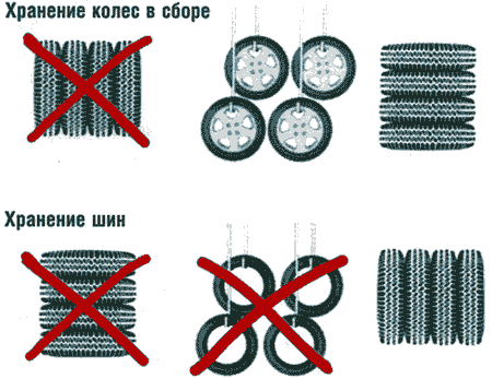 Колеса без дисков не правильно подвешивать, они могут деформироваться от длительной боковой нагрузки. Хранить в стопке шины без дисков допускается, но не более месяца и в штабеле высотой не более 5-6 штук. Хотя это не правильное положение для летних покрышек в гараже или ангаре.
