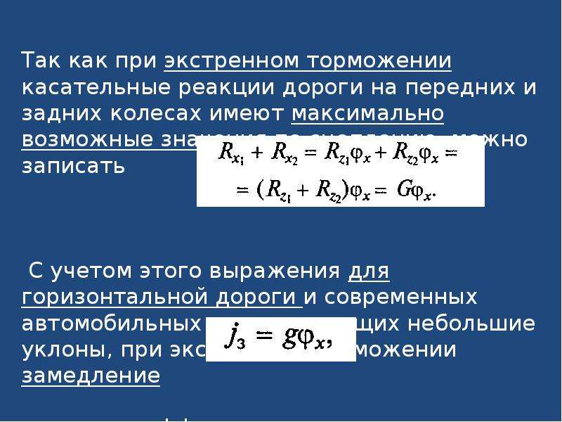 Расчет тормозного пути Для расчета минимального тормозного пути значение 0.8 — номинальное значение коэффициента трения покоя между хорошими шинами и хорошим дорожным покрытием. Как правило, коэффициенты кинетического трения меньше и могут быть значительно меньше для мокрых, обледенелых или масляных поверхностей.