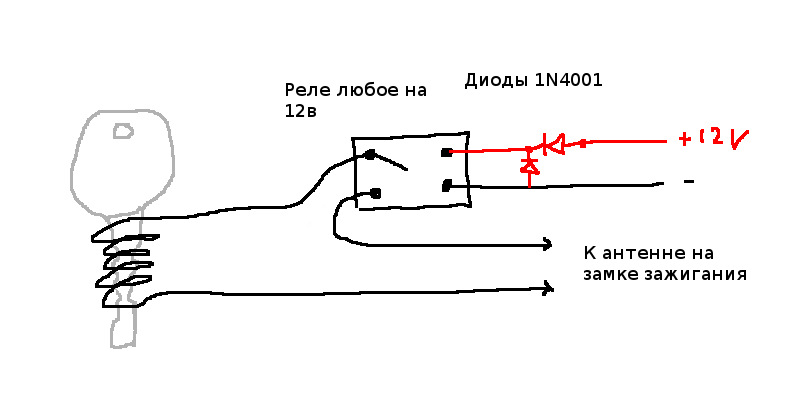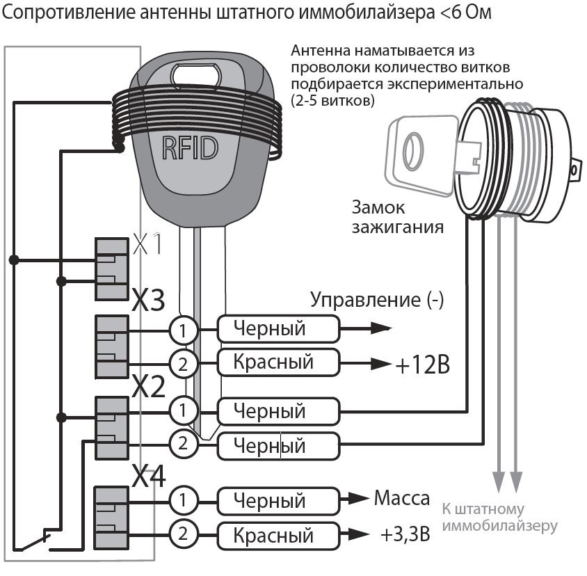 Для реализации задачи потребуется блок, внутри которого устанавливается метка либо ключ. В нем располагается передатчик импульсного сигнала, выполняющий основную роль при обходе. Комплектация устройства включает приемопередатчик, монтирующийся рядом с выключателем зажигания. Процедура подключения выполняется по схеме, а расстояние между антенным адаптером и модулем блокиратора будет минимальным. При активации системы обхода импульс подается через охранную установку на замок, что способствует распознаванию метки и пуску ДВС.