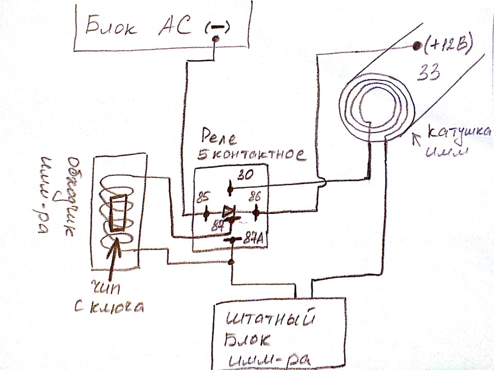 . Здесь не требуется всё время оставлять ключ в машине, однако безопасность «железного коня» всё же снижается. Важно иметь опыт монтажа электрооборудования, дабы не повредить автомобиль некорректной работой. - Приобретение дополнительного блока обхода. Такой способ весьма эффективен, так как у дополнительного блока имеется собственный пульт ДУ, позволяющий сначала отключить иммобилайзер, а уже после завести авто. С этого блока на систему постоянно подаётся сигнал, будто ключ всё время находится в салоне машины.