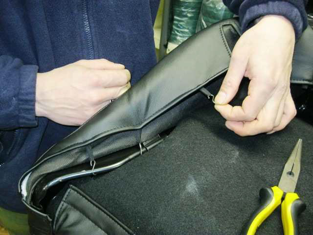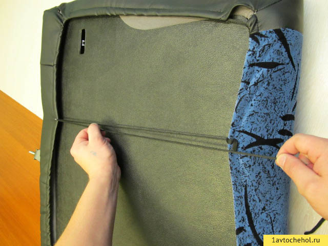 На заднее сиденье лучше надевать чехол на столе, и нужно предварительно подготовить шнур. Затяжка должна быть очень тугой, т.е. нужно подтягивая, сжимать ее по всему периметру. Во всяком случае шнура хватит для полной перетяжки крест на крест. Заднюю спинку одевать необходимо по принципу передней спинки, и так же нужно продеть все дырки под низ. При разработке лекал учитывается то, где можно заправить (дырки) вниз, а где, этого сделать нельзя по конструкции спинки и обивки. Как уже рассказывалось нами раньше, все заправляется очень туго, буквально с отверткой, треском, если это необходимо — то с надрезами.