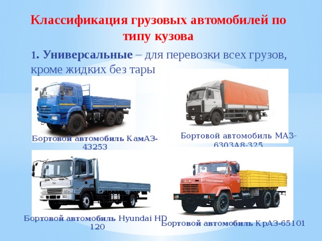 Причем реальная грузоподъемность может сильно различаться с той, что обозначена в ПТС. - Общепринятой классификации автомобилей не существует. Параметры, определяющие класс транспортных средств, расплывчаты. Также авто классифицируются в зависимости от марки.