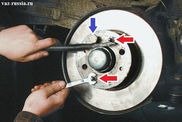 Удобнее действовать вдвоём — один напрягает ключ, второй бьёт. Чем больше гайка/болт, тем больше молоточек.