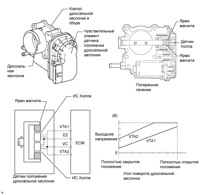 Датчик положения дроссельной заслонки (TPS) установлен напротив рычага ее управления и предназначен для определения угла открытия заслонки и передачи информации в электронный блок управления двигателем. Электронный блок управления автоматической коробкой передач также использует выходные данные этого датчика.