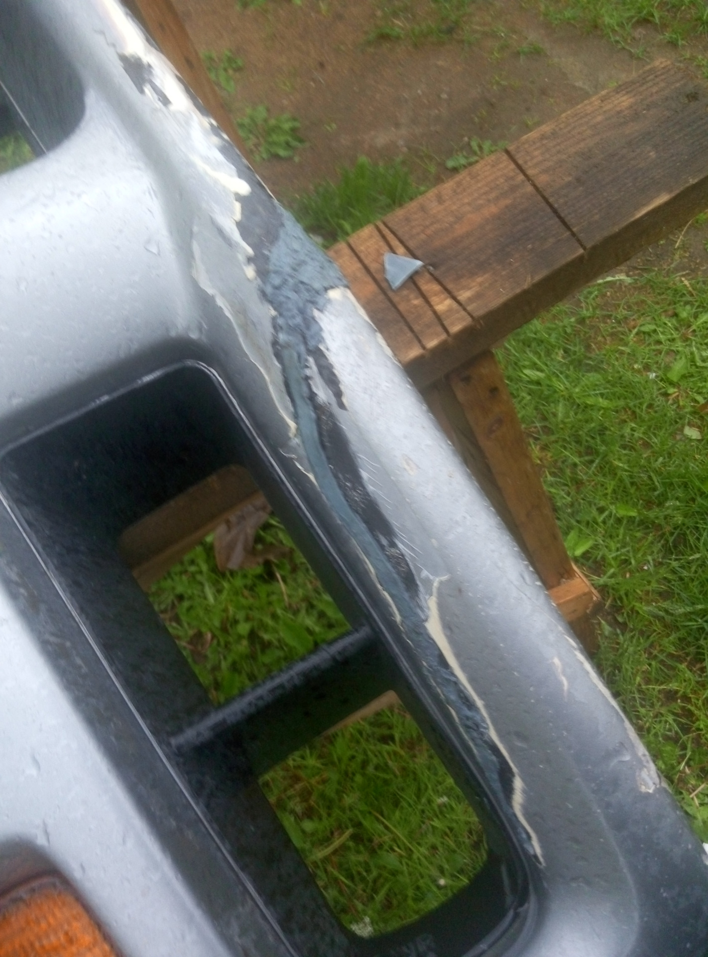 Шаг 16: На задней стороне зоны ремонта с помощью шпателя или шпателя Bondo нанесите средство для ремонта бампера . При нанесении средства для ремонта наклоните шпатель так, чтобы продукт проталкивался через трещину и выдавливался наружу через переднюю часть. Убедитесь, что вы покрываете область, простирающуюся примерно на 50 миллиметров от трещины.
