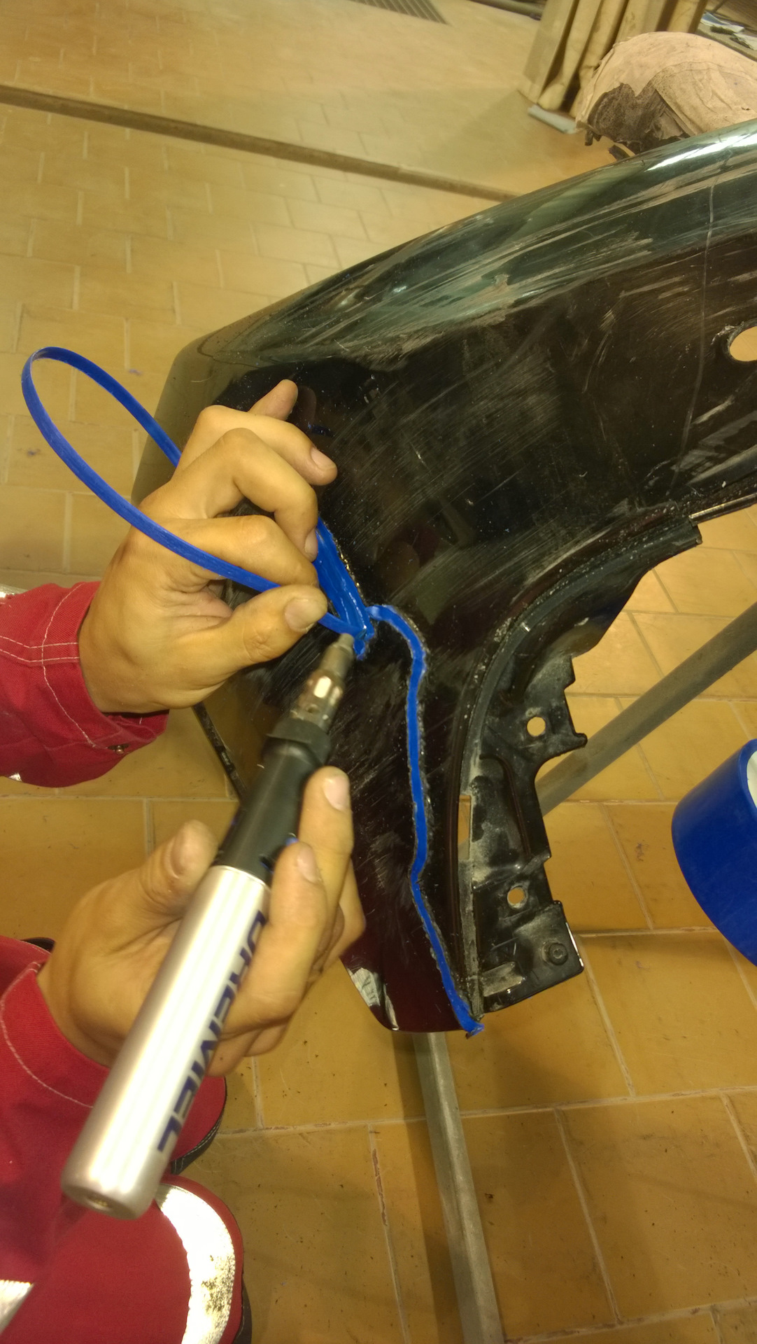 - Возьмите сварочный пруток из пластика и приложите к получившемуся углублению с лицевой стороны детали. Прогревая высокотемпературным феном для лучшего соединения.