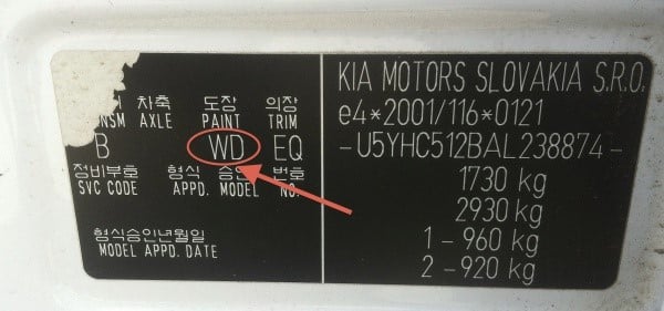 - Посмотрите на этикетке вин код эмали. Оттенок колера всегда указывается именно кодом. Запишите номер заводского цвета.