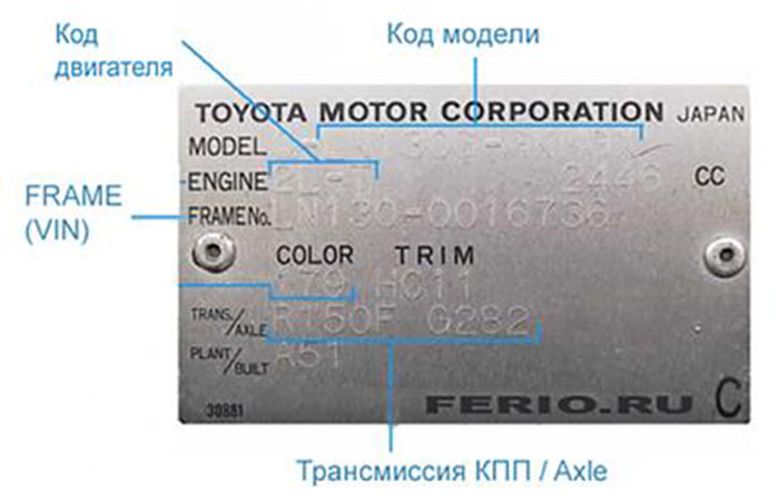 - В автомобилях Toyota табличка vin plate с указанием кода эмали может крепиться в нескольких местах: обычно это нижняя часть стойки передних дверей, либо под капотом у двигателя (040 – white, 202 – black).