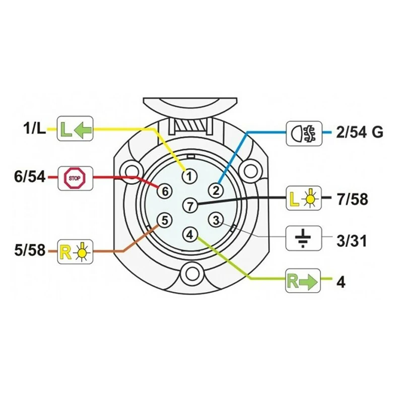 Российская схема выглядит так: 1 контакт – левый указатель поворота (желтый провод), 2 контакт – противотуманный фонарь (голубой провод), 3 контакт – «масса» (белый провод), 4 контакт – правый указатель поворота (зеленый провод), 5 контакт – резерв, 6 контакт – стоп-сигнал (коричневый провод), 7 контакт – габаритные фонари (черный провод).