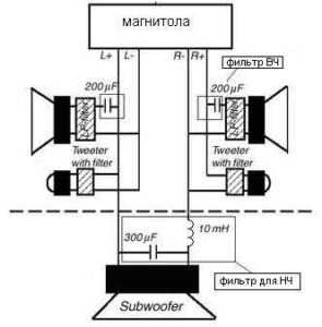 - Но и такая ситуация, когда в автомагнитоле выход на сабвуфер отсутствует, встречается довольно часто. В этом случае, соединение производится через выходы на колонки, с использованием фильтра для низких частот.