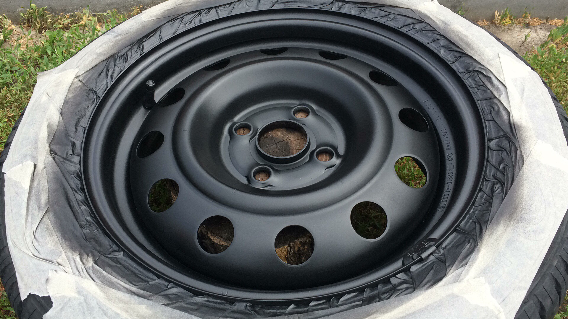 9. Закройте вентиль шины. Распылите толстослойную грунтовку [tl: gallery index = 11 size = 215 × 129] вокруг колеса.Лист бумаги в борте шины удерживает краску от шины.