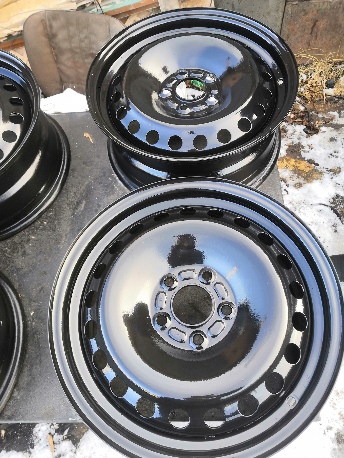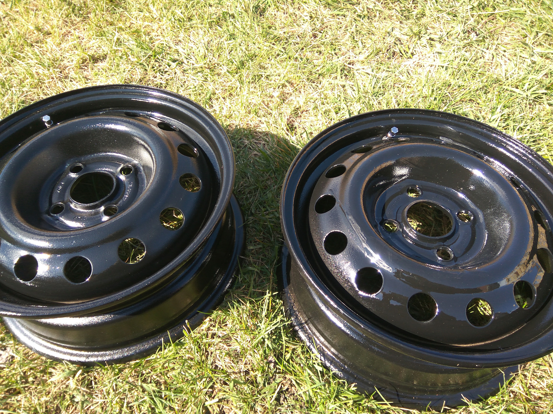 На последнем этапе диск лакируется: рекомендуется делать 2 слоя лака, поскольку он значительно продлевает срок эксплуатации покрытия дисков. Сушить отреставрированные своими руками диски следует около трех дней. Ниже представлено фото покрашенных дисков.