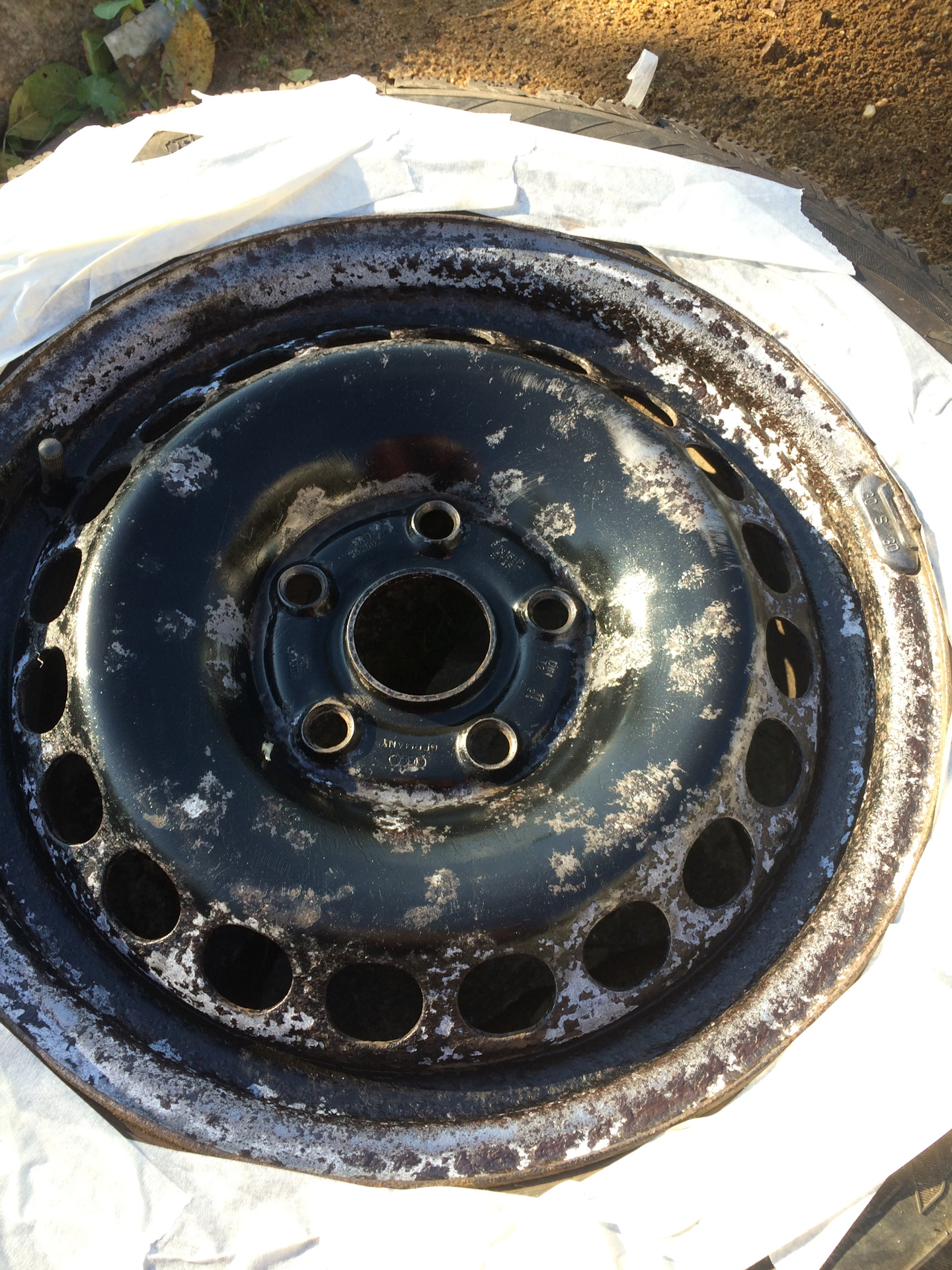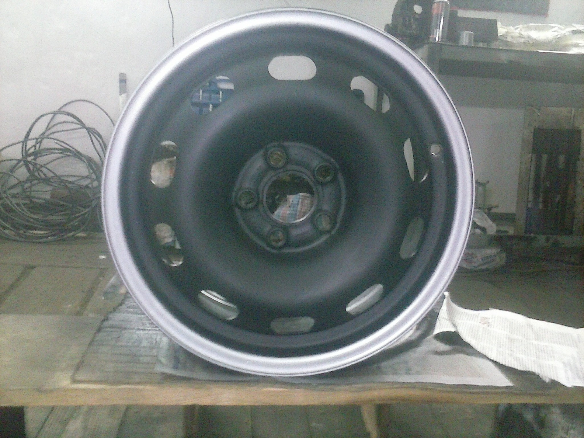 Деталь следует тщательно очистить от старой краски, ржавчины и всевозможных загрязнений. Делать это можно с помощью электродрели, инструментов или пескоструйного аппарата. Для основательной очистки применяются также кислотные и щелочные составы. - Покраска колесных дисков. Работу следует выполнять в специальном костюме и защитной маске. Краска равномерно распыляется с помощью электростатического пульверизатора на диск.