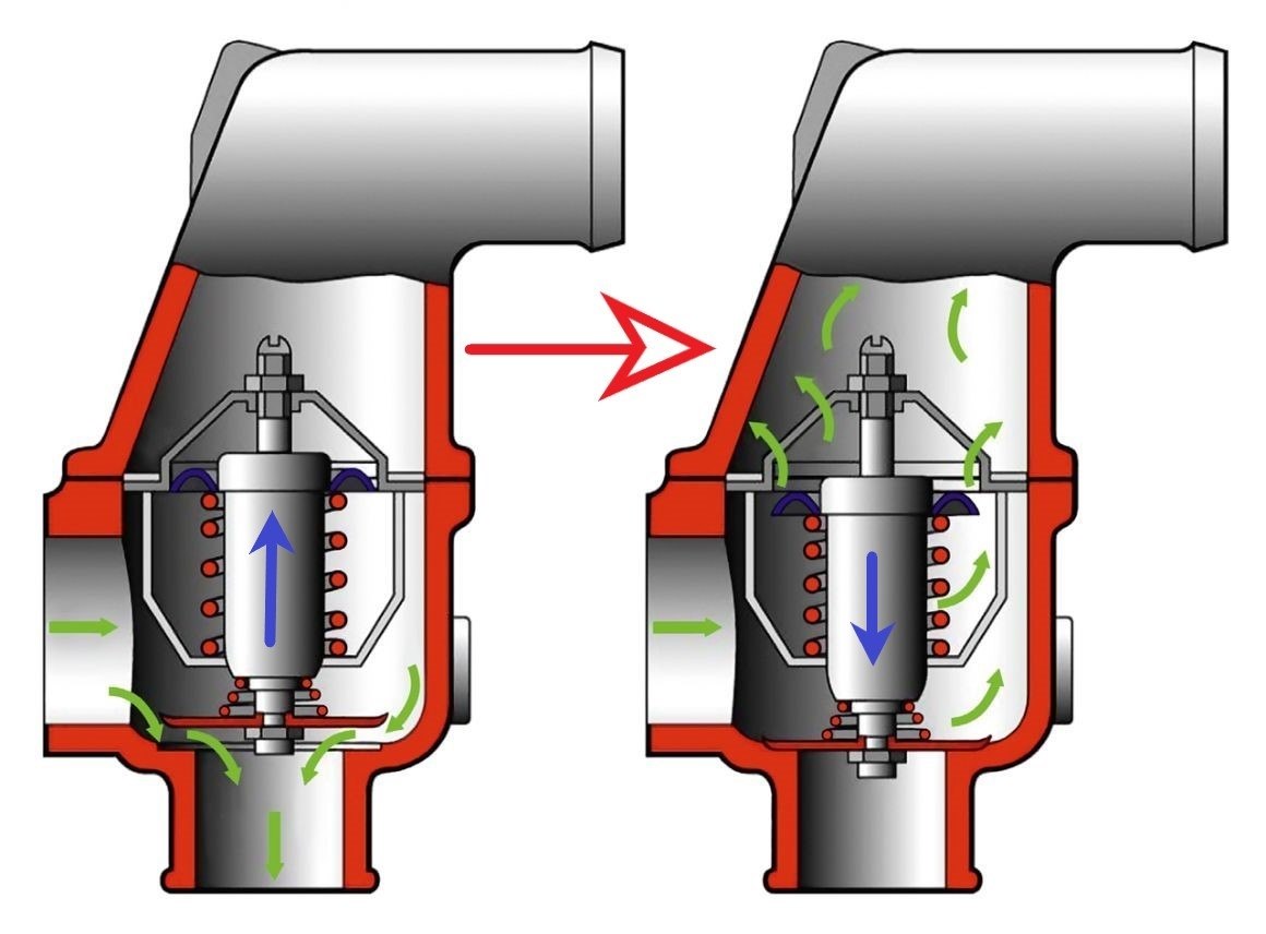Когда охлаждающая жидкость нагревается сильнее, чем надо, начинает срабатывать клапан. Он приоткрывается, и горячий антифриз поступает к основному радиатору. Там он охлаждается и возвращается обратно в малый контур. Если дать двигателю серьёзную нагрузку, он будет перегреваться интенсивнее. В таких случаях термостат открывается полностью, дабы как можно больше охлаждающей жидкости поступило к радиатору для охлаждения.