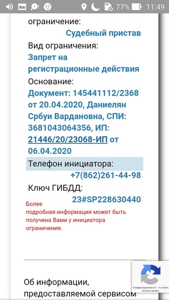 Например, если запрет наложен судебным приставом для обеспечения исполнения исполнительного документа, необходимо фактически исполнить содержащиеся в нем требования. Сведения о наличии задолженности можно узнать на сайте ФССП России с помощью сервиса «Банк данных исполнительных производств». Аналогичные сервисы функционируют на сайтах ГУОБДД МВД России — «Проверка штрафов» и Федеральной налоговой службы — «Заплати налоги».