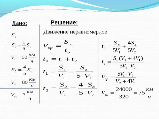 - vср=S/(t1+t2+…+tn), где S — общее пройденное расстояние,