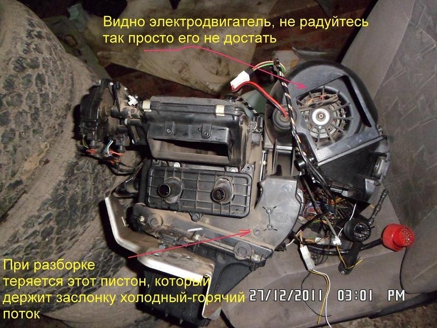 - Когда вы увидите электромотор, просто отключите его и отсоедините от всех креплений, поменяйте на новый. При демонтаже отопителя вы можете столкнуться с проблемой заводского брака — патрубок, к которому подключен радиатор отопителя, может быть наглухо перетянут фиксатором. Из-за этого антифриз будет с трудом поступать в радиатор. Исправьте проблему.