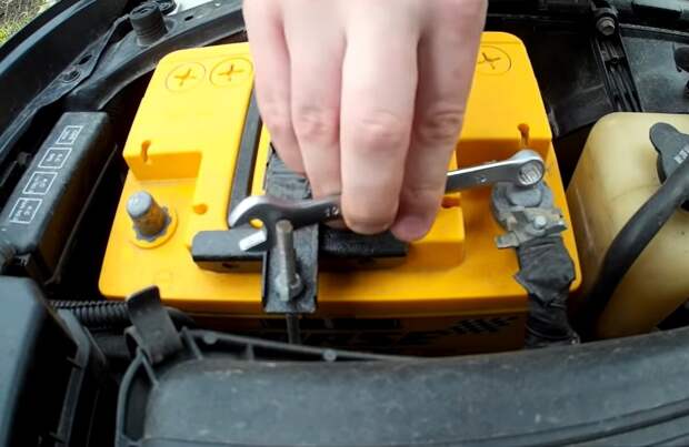 Теперь нужно открыть капот автомобиля и снять клемы. Для этого вам потребуется рожковый ключик, которым вы сможете ослабить затяжку клем. Скорее всего это ключик на 10 мм.