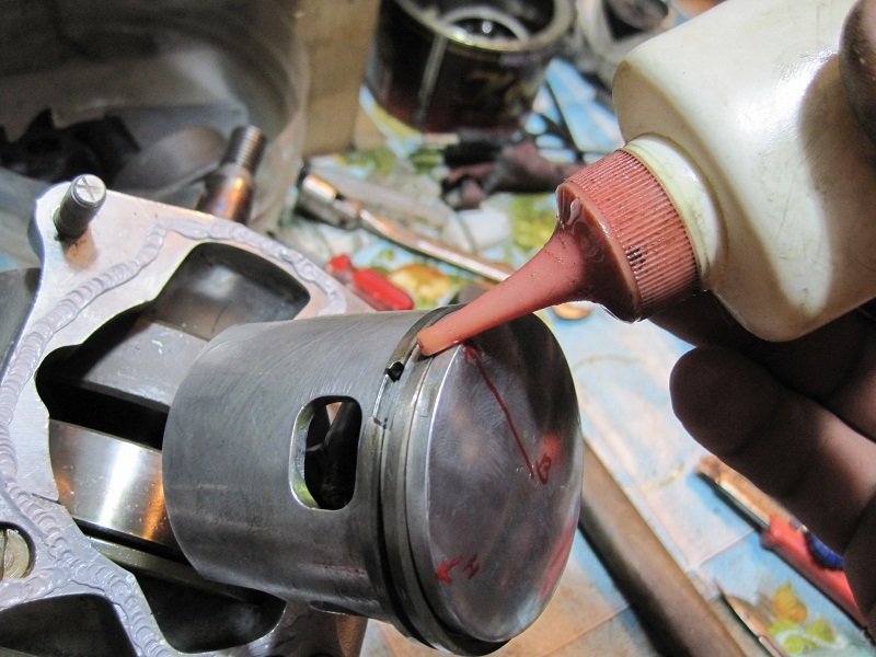 Нанесите пальцем слой моторного масла на стенку цилиндра.Затем нанесите слой масла на внешнюю сторону нового поршня (на внешнюю сторону колец, на кольцевой ремень и на юбки). Вы не хотите, чтобы ваш новый поршень и кольца ломались в сухих условиях. Используйте обычное моторное масло, которое вы используете в своем 4-тактном двигателе.