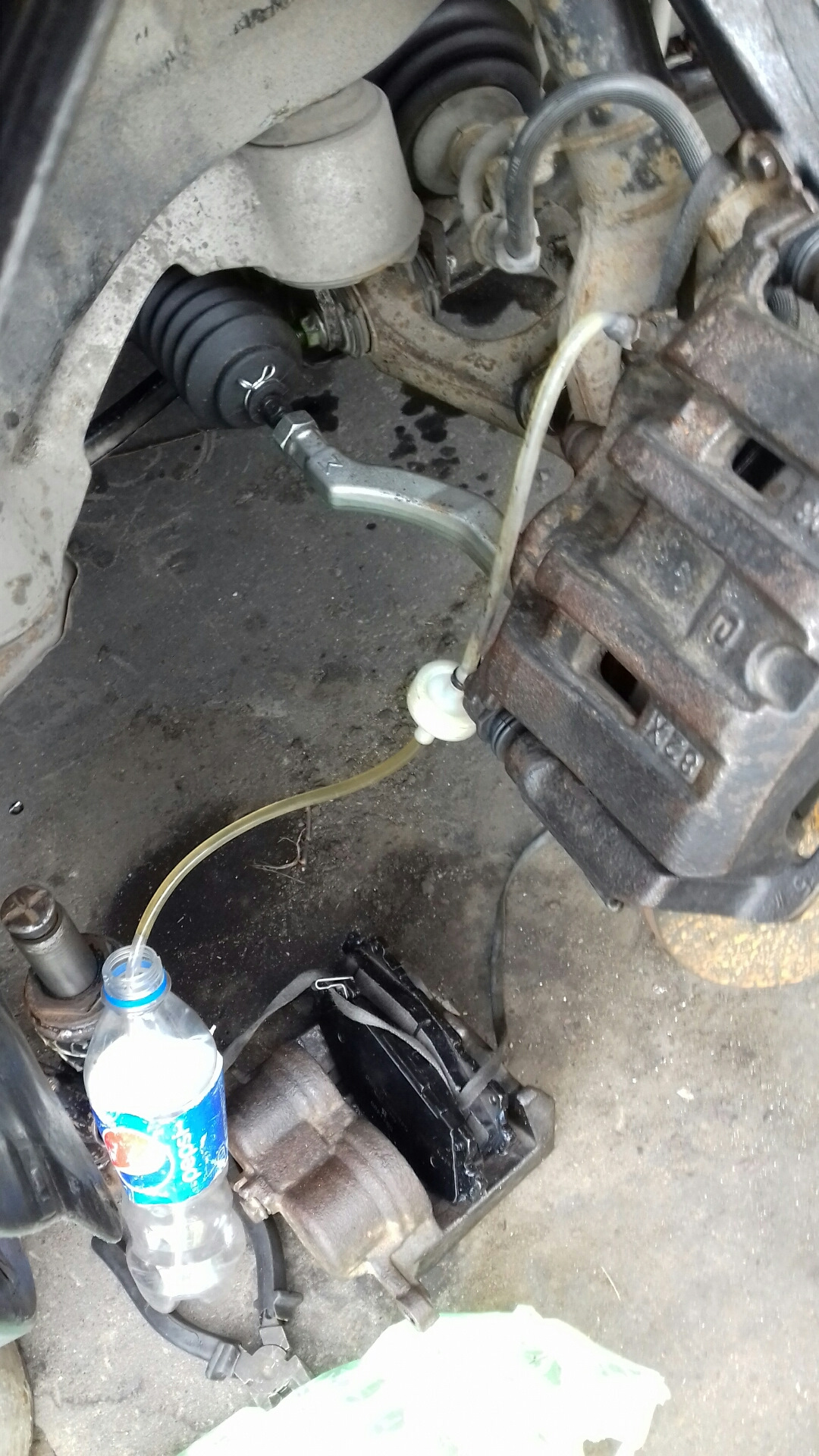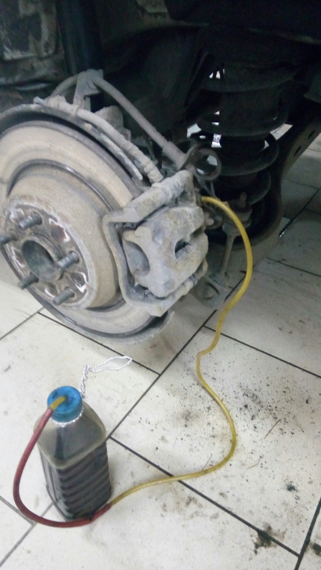 ПРИМЕЧАНИЕ: Видите, как вы пропустите тормозной шланг от штуцера для прокачки и пропустите его через пружину? Когда вы открываете штуцер для кровотечения и начинаете кровотечение, жидкость поднимается вверх. Итак, если вы нажмете на педаль, а затем отпустите, при нажатии на педаль жидкость (или смесь жидкости и воздуха) уйдет, а воздух поднимется вверх. Благодаря гравитации. Когда вы отпускаете педаль, тормозная жидкость втягивается обратно, но только жидкость возвращается, потому что воздух идет вверх. Этот трюк не только позволяет прокачать себя, но и если вы меняете суппорты, а затем необходимо прокачать эту сторону, он также сокращает количество нажатий на педаль и, следовательно, количество тормозной жидкости. сняли с машины, поэтому, если вы будете делать это много, может потребоваться от кварты до пинты.Удобно, а?