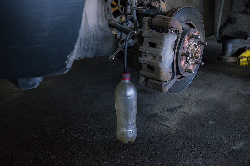Поскольку емкость для сбора тормозной жидкости специально держать никто не будет, то нужно заранее ее закрепить во избежание опрокидывания.
