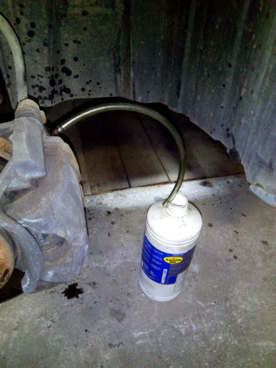 Протяните шланг ВЕРХ через пружину, а затем вниз и в какой-нибудь кувшин, например Под рукой 5-литровый кувшин для масла или старый галлон молока. Залейте его на 1/3 водой, если не хотите беспокоиться, упадет ли он и попадет ли тормозная жидкость на предметы, так как она вызывает коррозию и все такое.