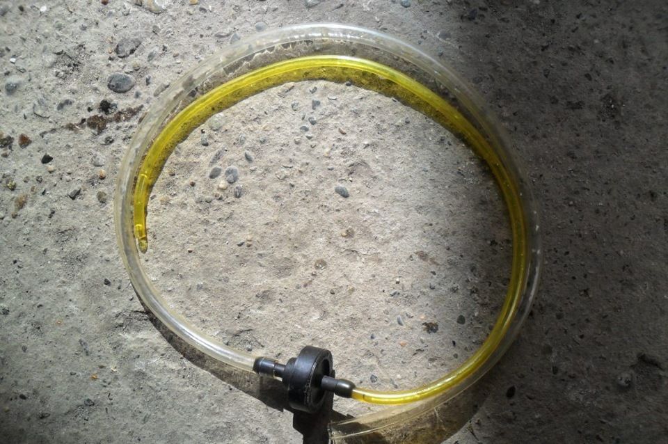 — с помощью длинного шланга и тары с ТЖ.