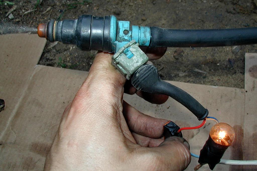 На одном из выводов должна загореться контрольная лампа, это источник питания форсунки, идущий от компьютера.Если контрольная лампа не горит, проблема обнаружена. Осмотрите сторону питания цепи на предмет плохого соединения по цепи или перегоревшего короткого предохранителя.